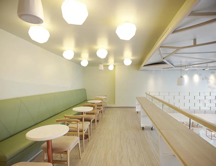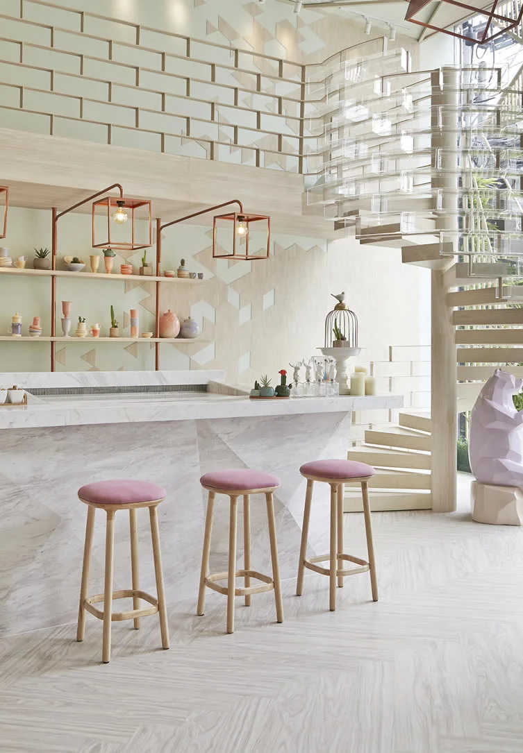 If a trip to Bangkok is in your future, a stop at Shugga Bakery, a desert bar is called for, especially if thoughtful design makes your heart flutter. The prismatic restaurant is accented with lucite detail (like a spiral staircase!) pastel pink stools, mint green banquets and light woods. Here is a peak inside.