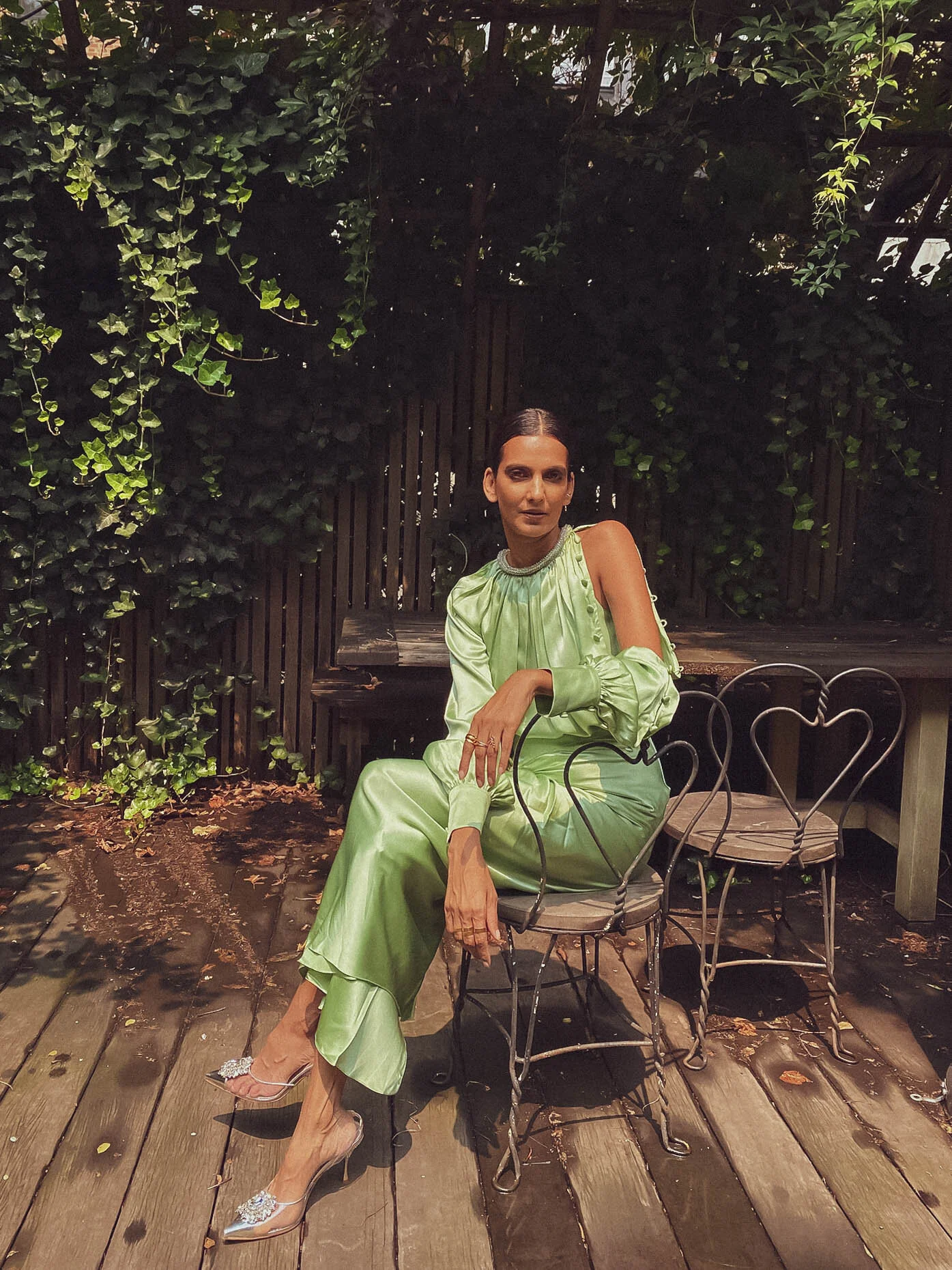 Poorna is wear Prabal Gurung and shoes by Ingrid Incisa di Camerana.